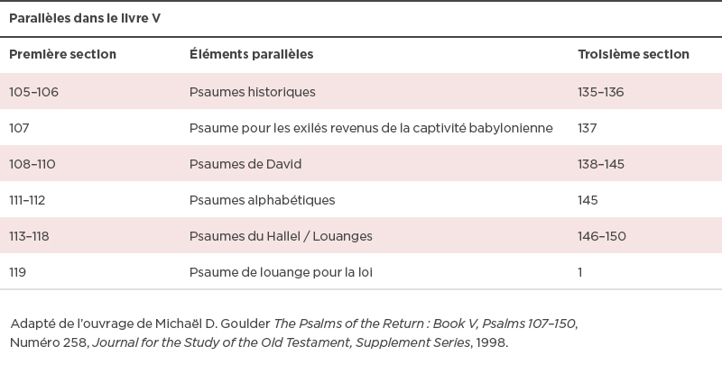 Cette construction parallèle délibérée peut être prolongée dans deux directions en prenant en considération les psaumes historiques qui précèdent les deux sections. À la fin du livre IV, nous avons vu que les psaumes 105 et 106 reprennent l’histoire d’Israël respectivement depuis Abraham jusqu’à son installation dans le pays et depuis l’exode jusqu’à l’exil. Le psaume 106 finit par une prière pour que Dieu délivre les captifs de toutes les nations qui les retiennent. Ce qui amène au psaume 107 qui, d’abord, remercie de ces libérations. La troisième section du livre V débute par les deux seuls autres psaumes historiques du livre : 135 et 136. Le début de ce dernier reprend les mêmes mots que les psaumes 105 et 106 : « Louez l’Éternel, car il est bon. » Le psaume 137 porte un regard rétrospectif sur la captivité, en l’observant depuis la délivrance.