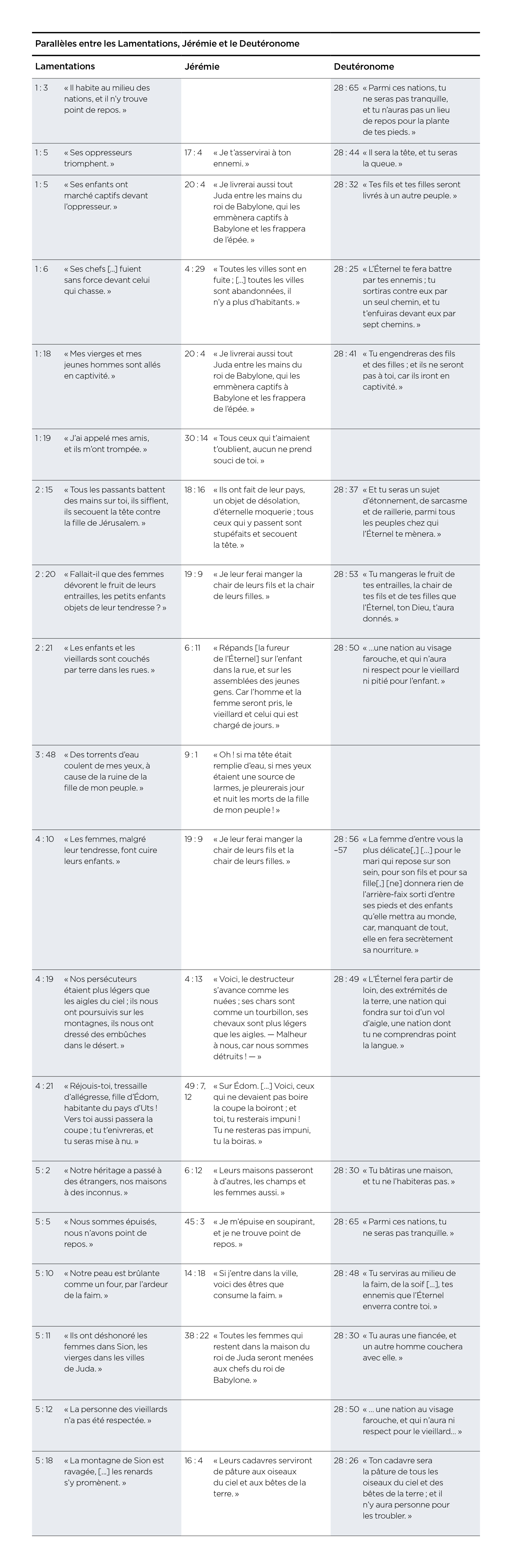 Pour comprendre les Lamentations, il peut être utile d’observer les correspondances avec le livre de Jérémie, mais aussi avec le Deutéronome. De nombreux thèmes récurrents apparaissent. Il devient évident que la nation de Juda (et d’Israël dans son ensemble) avait été avertie des conséquences si elle déviait du chemin que Dieu lui avait montré. Un grand nombre de détails spécifiques à la chute finale de la nation figurant dans des passages des Lamentations et de Jérémie avaient été énoncés par Moïse des siècles plus tôt.